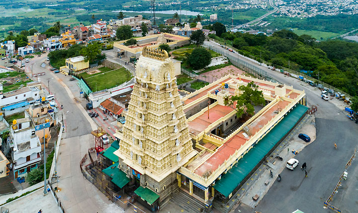 It is located about 13 kms from Mysure at the top of the hill and is considered one of the 18 Maha Shakti Peethas in India. The temple is dedicated to the Hindu goddess Chamundeshwari, an incarnation of the goddess Shakti. The temple has a very beautiful idol of the goddess wearing a garland of skulls.